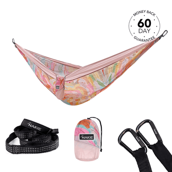 The Nakie hammock design is focused on providing an ultra light hammock to be used for hiking, camping, or just everyday use. We needed a hammock that was eco-friendly, extremely portable and easy to use. Each hammock weighs only 600 grams and we use no knot hammock straps and carabiners to make setting up your hammock a breeze. It can take less than a minute to set up and be relaxing in your Nakie hammock.