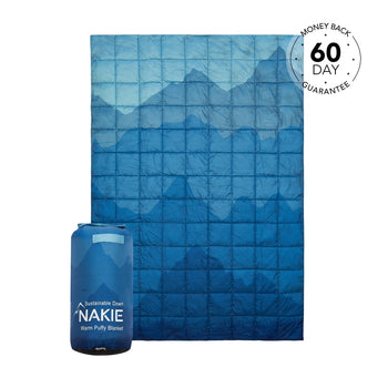 • Studio shot featuring two Nakie puffy blankets, highlighting their cozy warmth and sustainable design for outdoor relaxation and comfort